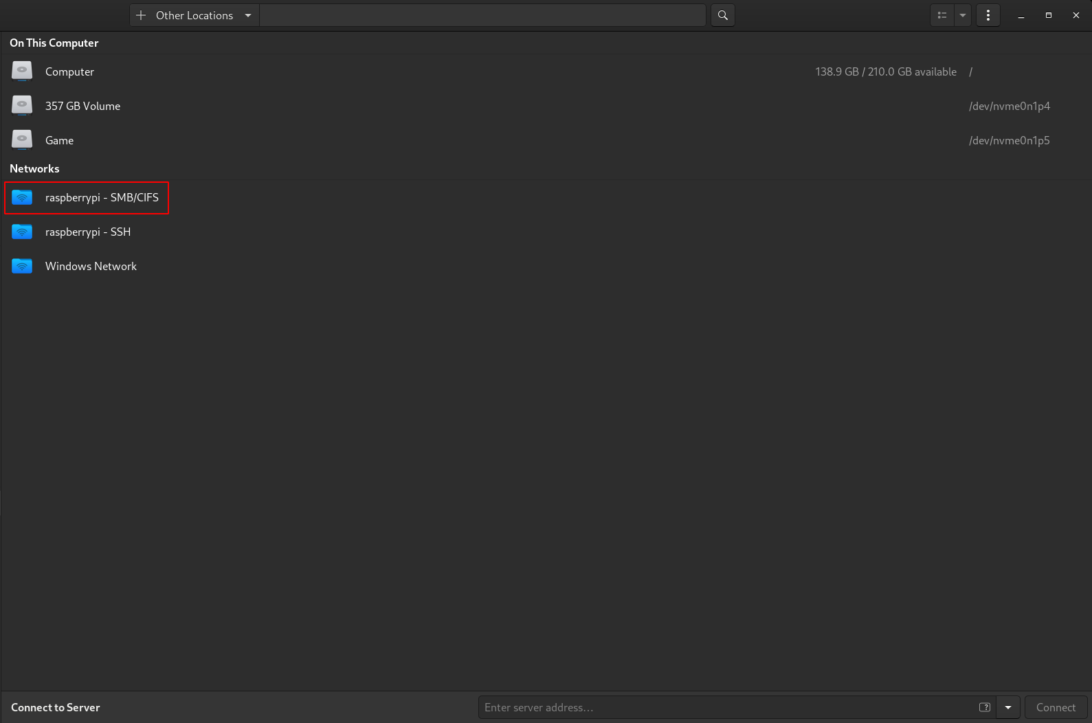 在 Gnome 的 nautilus 就可以看到了,如果不行下面也可以自行輸入地址,舉例來說:smb://192.168.1.1