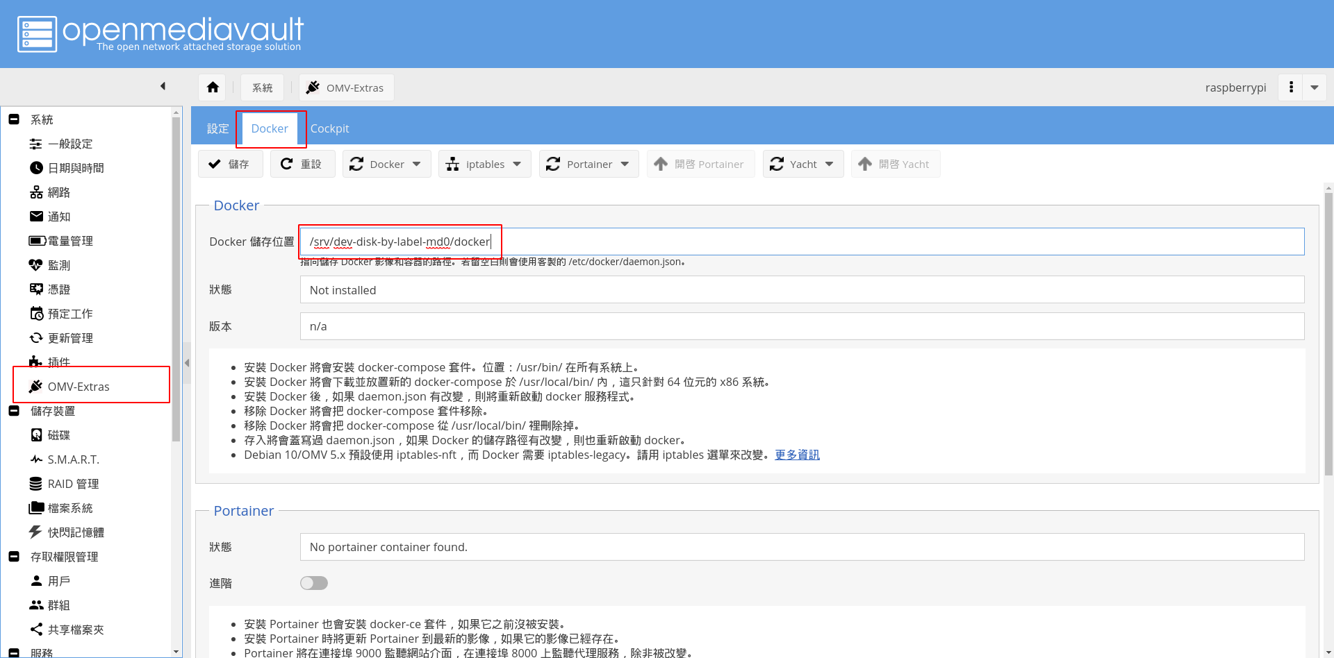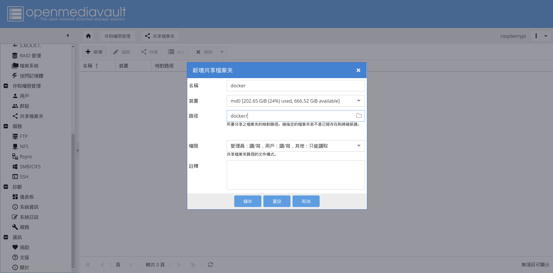 因為想要把 docker 的資料存在 RAID 上,所以先去 RAID 的根目錄建一個目錄叫 docker,並拿到絕對路徑:/srv/dev-disk-by-label-md0/docker,之後到 OMV-Extras > Docker 做設定