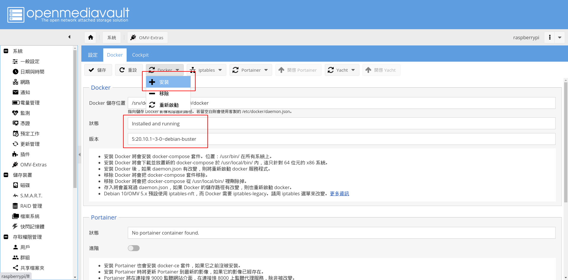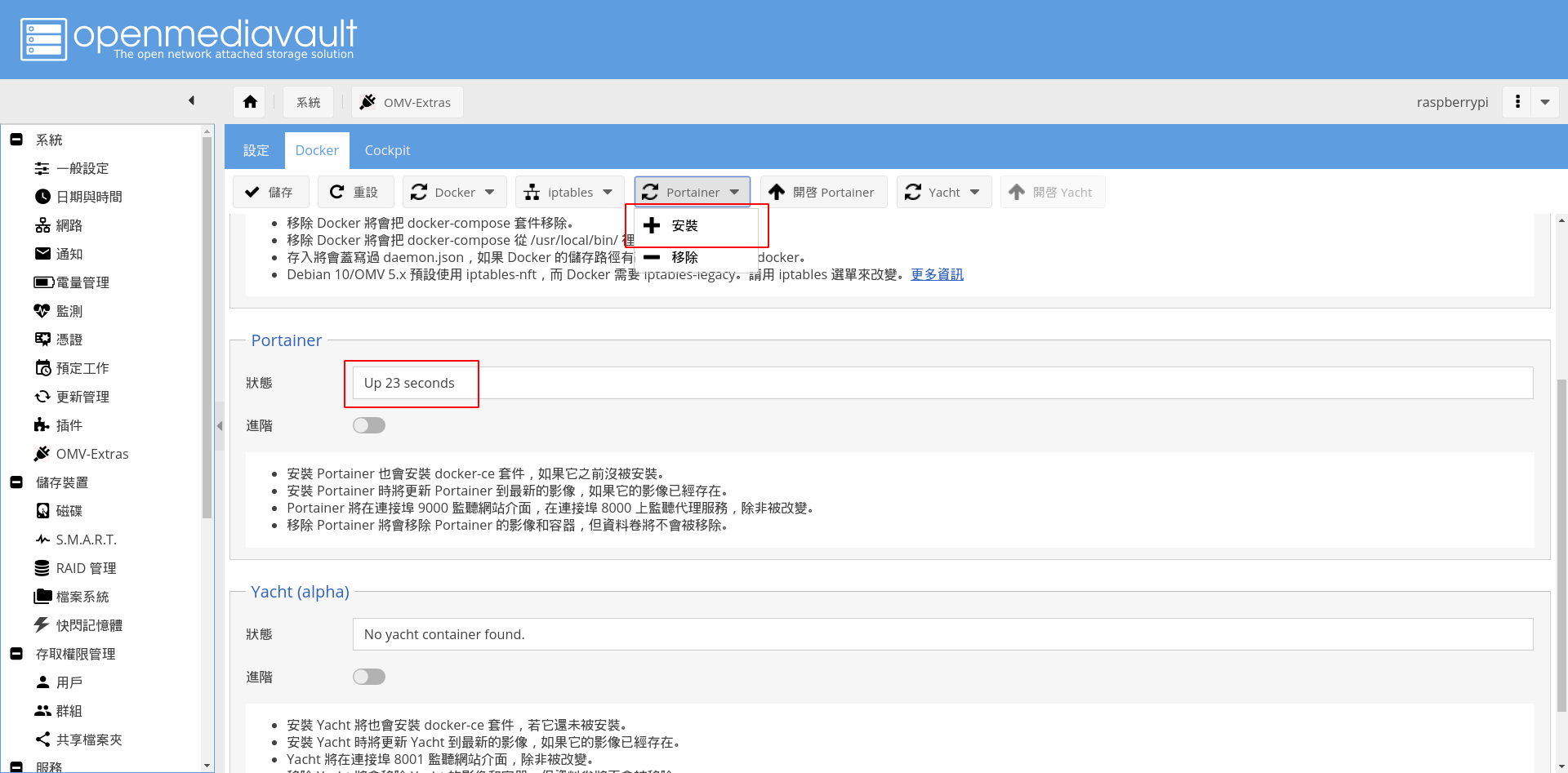 portainer 也可以順便裝一下,OMV 會建立一個 portainer 的 docker container 並跑在 9000 port 上