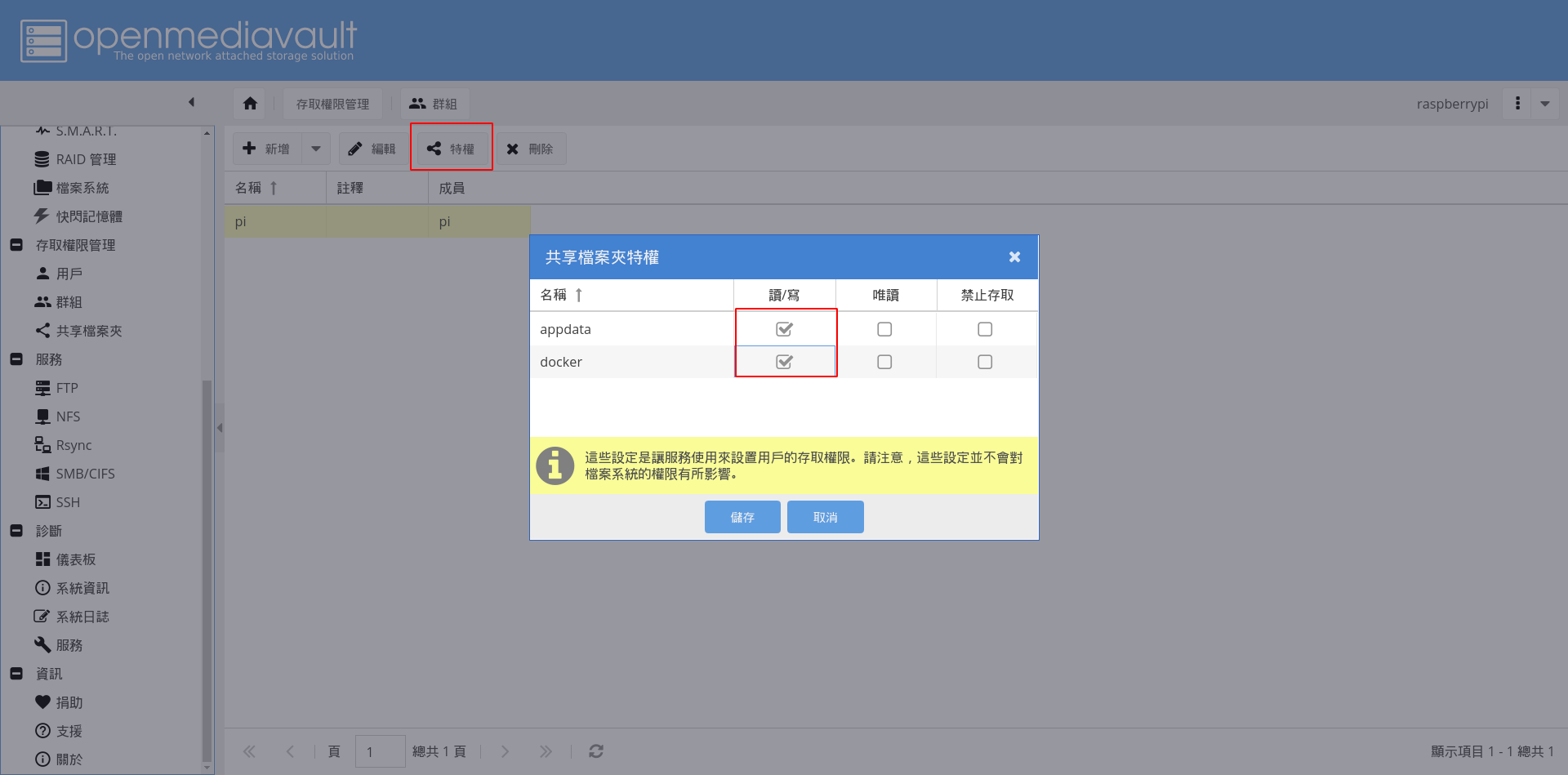設定 pi 群組的共享檔案夾權限 (在共享檔案夾那邊也可以設定,在群組的設定也是面對共享檔案夾的)