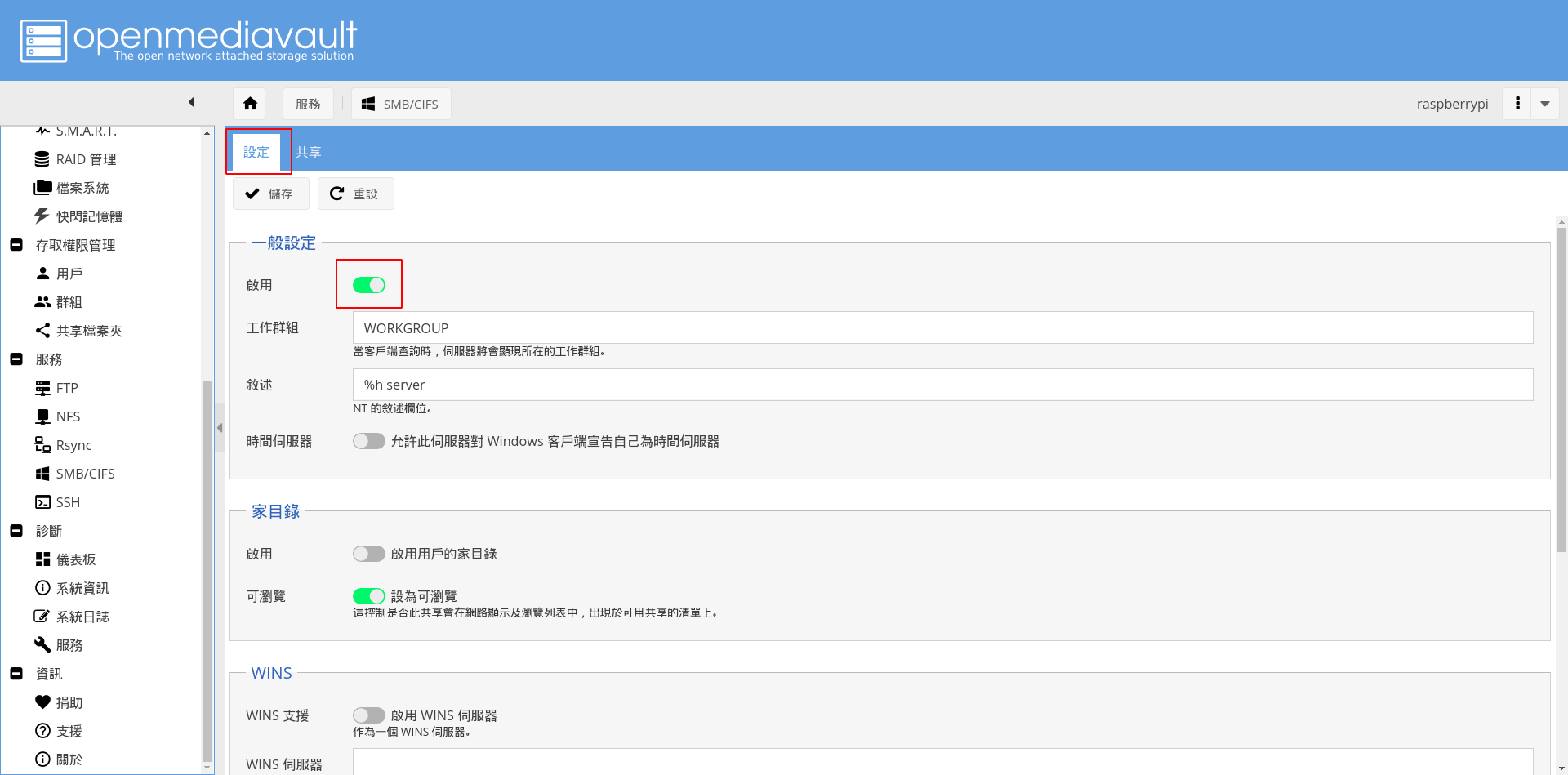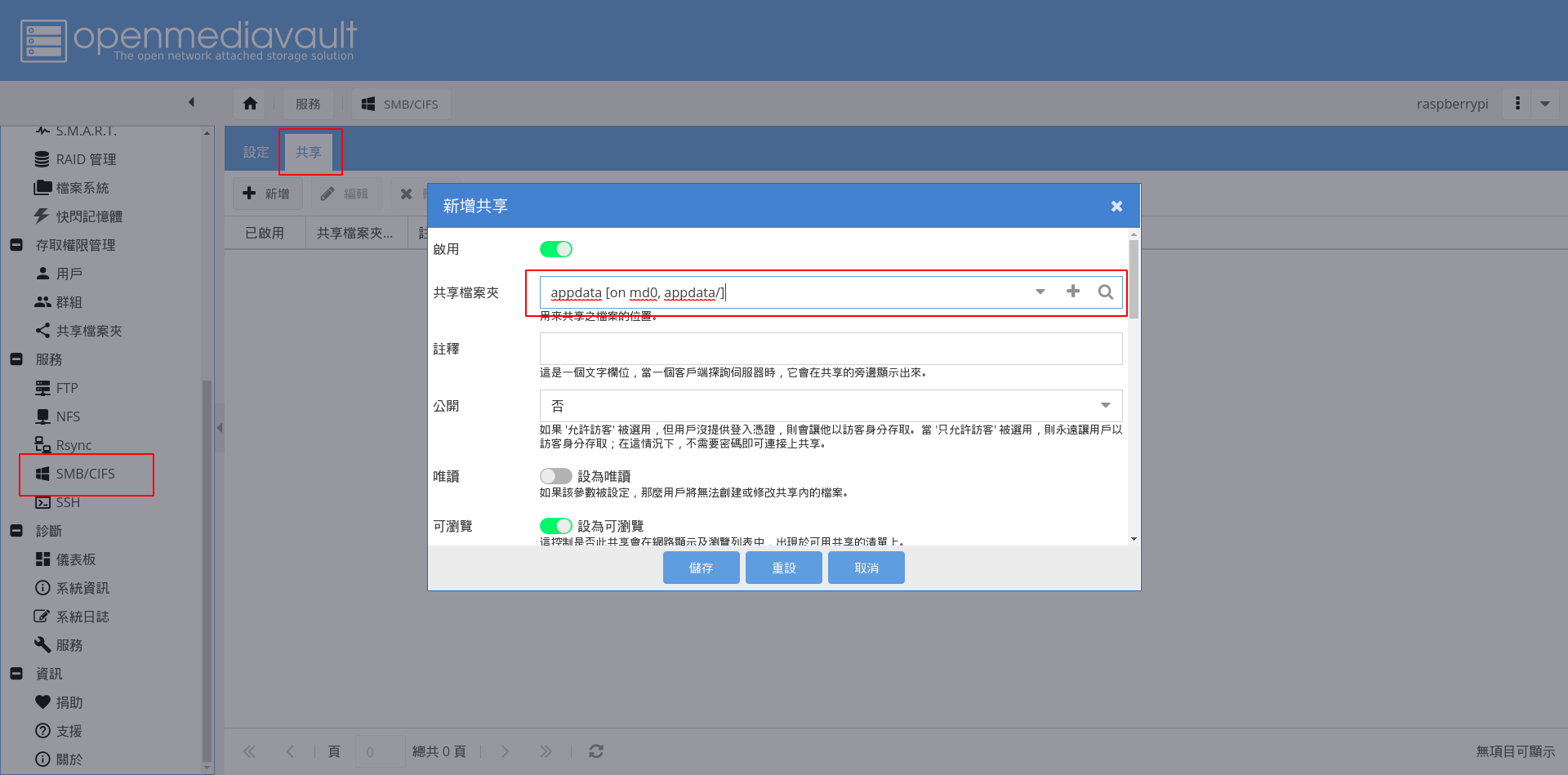 之後可以到 SAMBA > 共享 那邊設定要分享出去的資料夾