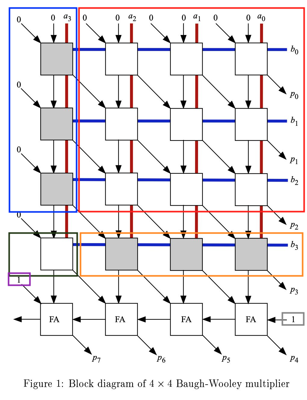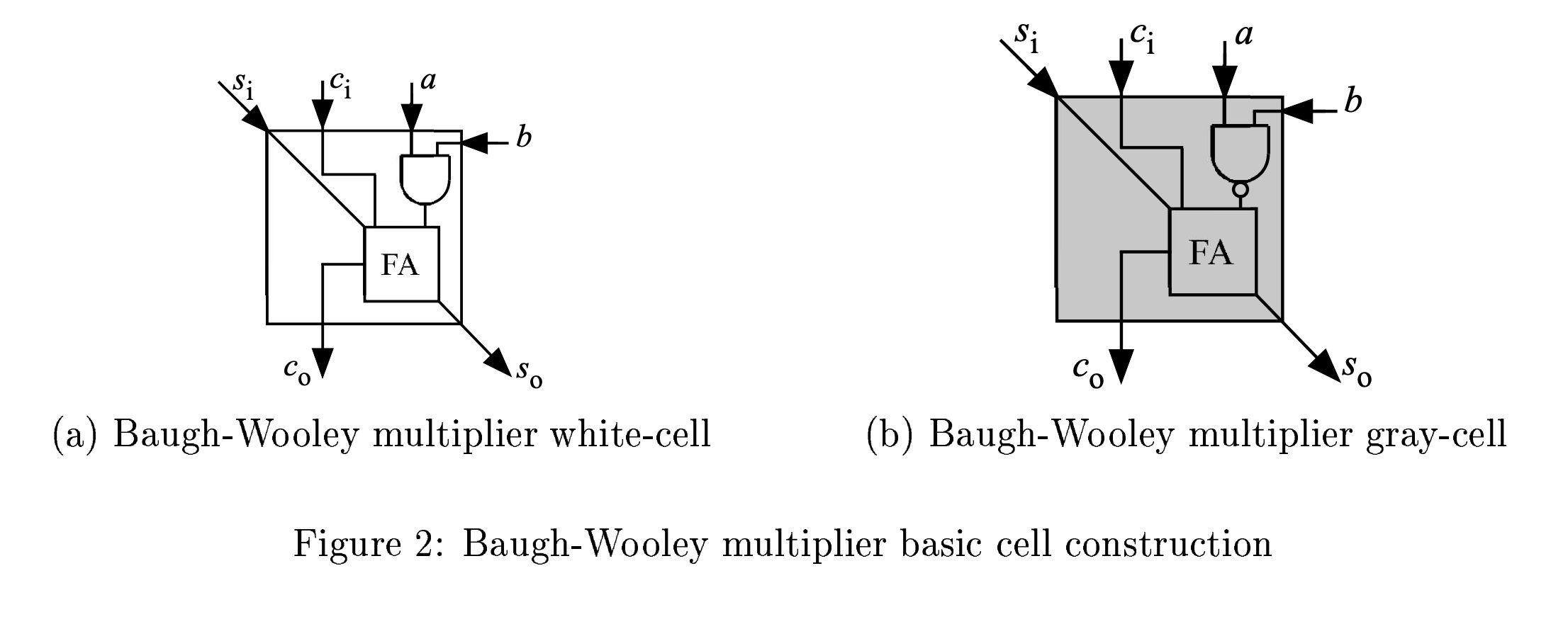 $$ P = a_{n-1} b_{n-1} 2^{2n-2} + \sum^{n-2}_{i=0} \sum^{n-2}_{j=0} a_i b_j 2^{i+j} + 2^{n-1} \sum^{n-2}_{i=0} \overline{a_i b_{n-1}} 2^i + 2^{n-1} \sum^{n-2}_{j=0} \overline{a_{n-1} b_j} 2^j - 2^{2n-1} + 2^n $$硬體