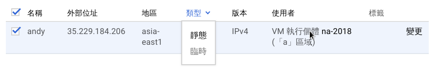 到選項中的 VPC網路\外部IP位址,把臨時改成靜態,設一下名字就完成了。