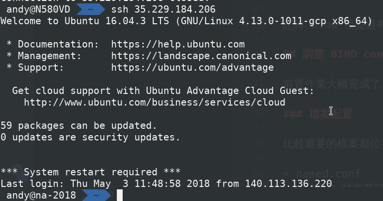 環境搞定後,就可以透過 terminal SSH 進去剛剛建好的 server 了。(記得中繼資料要加好SSH-key)