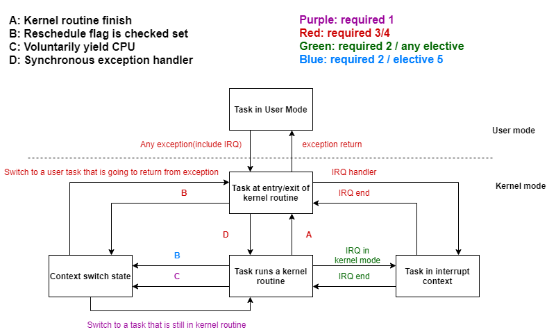 - Task in interrupt context (interrupt 可能發生在 user mode 或是 kernel mode,interrupt context 不屬於任何 task,使用 interrupt stack)
