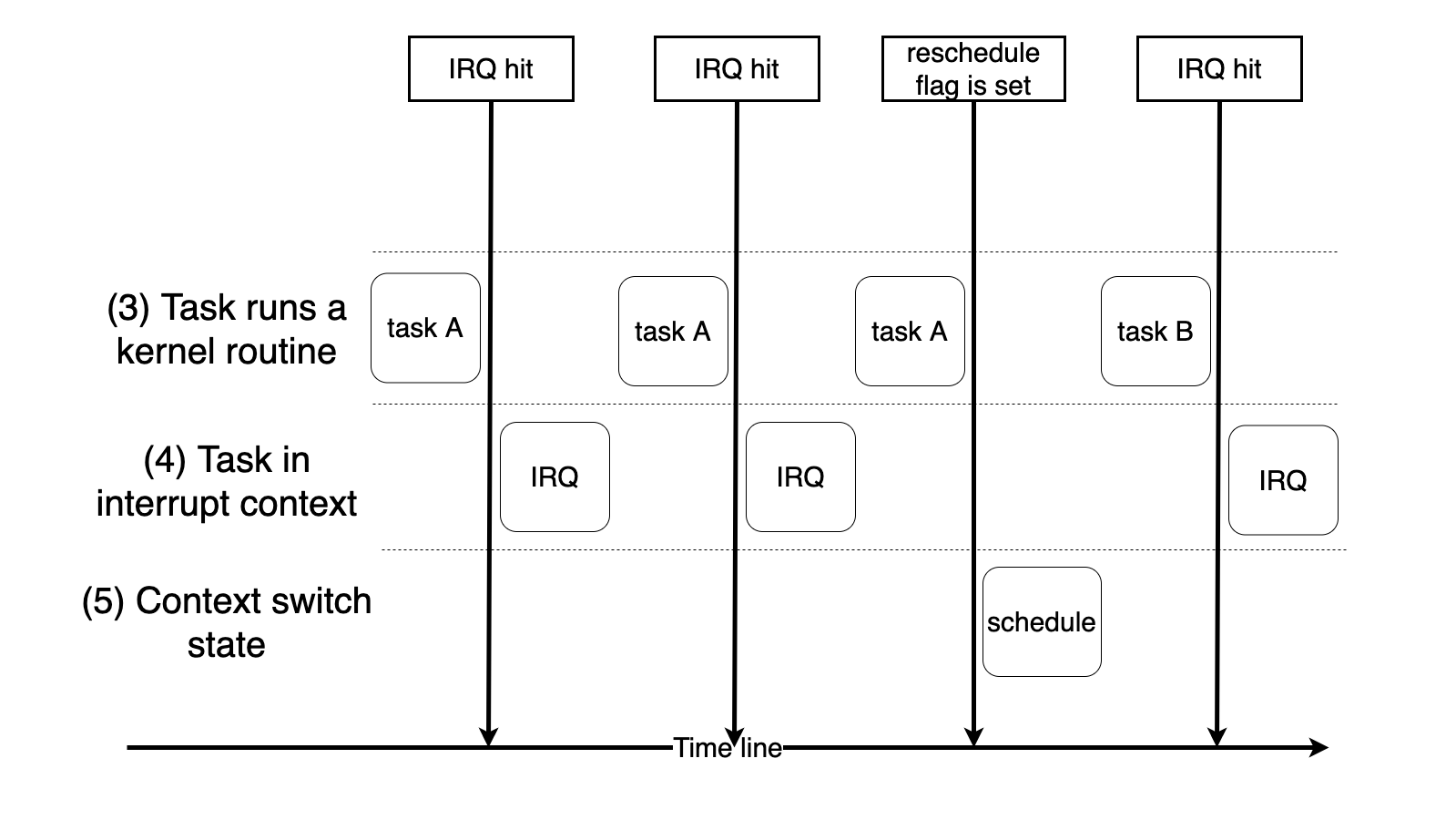 在離開 interrupt handler 前檢查 task structure 的 reschedule flag,如果有設定 reschedule flag 就進行 reschedule。